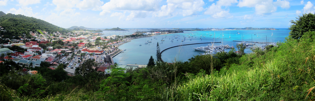 A panoramic view of Marigot and it's harbor from the hilltop next to Fort Louis.