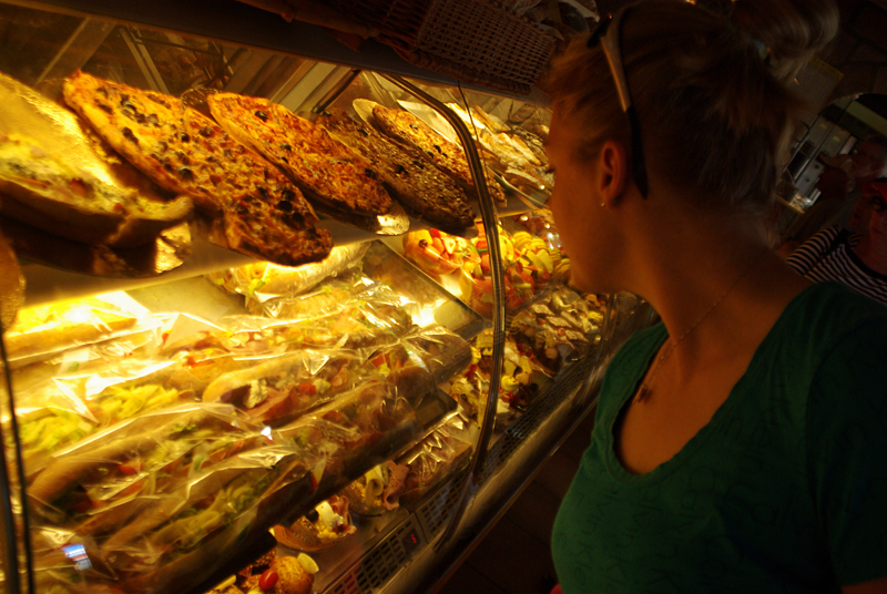 | Heading out of the fish and produce market and into the main market. |