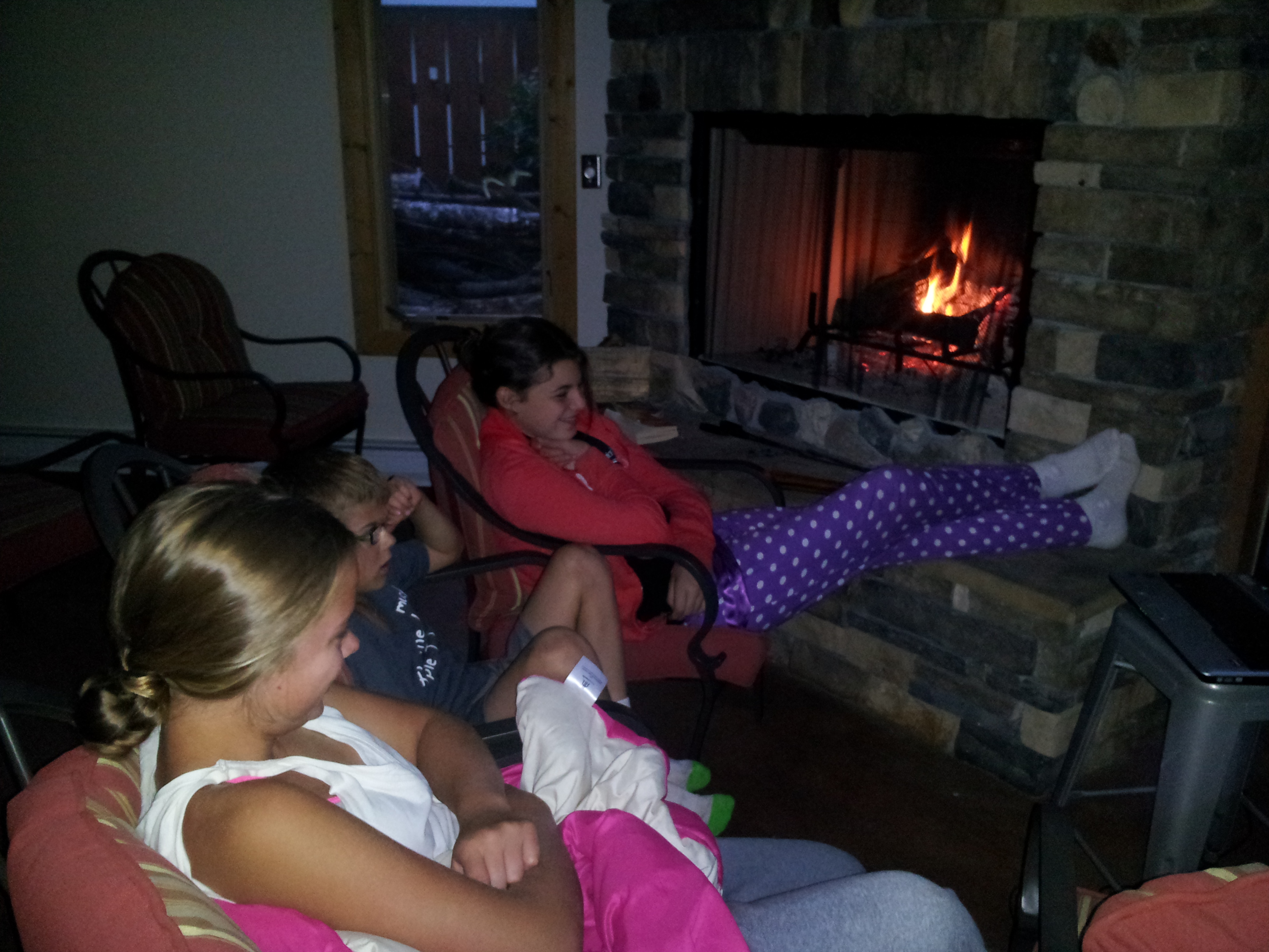 Used to the Caribbean heat, Andi is bundled up next to the fire in the middle of July (photo by Win Anderson)