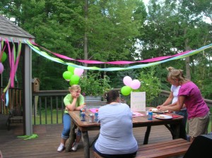Win Anderson (in the pink shirt) plus mom and girls from the Beard family setting up dinner on the deck(photo by Andi)