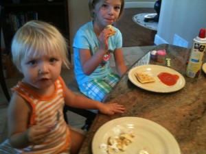 Piper and Katelyn eating breakfast together. Piper LOVED the attention showered on her by her cousins