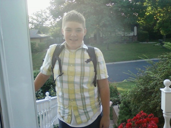Tanner outside Grandma Holm’s house on his first day of Junior High… with SHORT HAIR!! 🙂